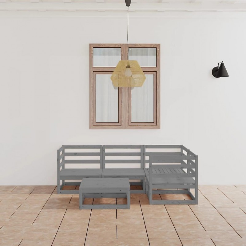 Culoare: Gri, Material: Pin masiv, Dimensiunile canapelei din mijloc/de colț (per unitate): 70 x 70 x 67 cm (L x A x Î), Dimensiunile mesei: 70 x 70 x 30 cm (L x A x Î), Necesită asamblare: Da, Capacitate maximă de încărcare (per loc): 110 kg, Livrarea include: 3 secțiuni de canapea de colț, 1 secțiune de canapea din mijloc, 1 masă