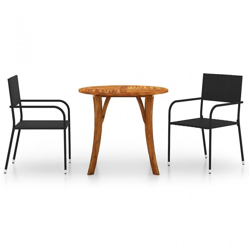 Masă: Material: Lemn masiv de salcâm uleiat Dimensiuni: 85 x 75 cm (diametru x înălțime) Lățime blat: 2 cm Scaun: Culoare: Negru Material: Ratan poliuretanic, oțel Dimensiuni: 51 x 60 x 87 cm (lățime x adâncime x înălțime) Lățime șezut: 48 cm Înălțime șezut: 42 cm Necesită asamblare: Da Livrarea include: 1 masă, 2 scaune