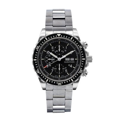 Ceas Marathon Jumbo Pilot/Diver Automatic Chronograph (CSAR) de 46 mm, din oțel inoxidabil. Cronograful Jumbo Pilot/Diver Automatic Chronograph (CSAR) de 46 mm este cunoscut în mod obișnuit ca un cronograf de căutare și salvare (CSAR) și este cel mai popular din gama noastră SAR. Este considerat „sfântul graal” al ceasurilor noastre și alegerea perfectă pentru cei care cer cea mai bună calitate și performanță. Având un mecanism cronograf automat cu 25 de rubine, cu o precizie de 1/5 de secundă, funcția de cronometru utilizează sincronizare zecimală cu o precizie de 1/100 de minut pentru jurnalele de zbor și urmărirea consumului de combustibil. Ceasul poate urmări timpul scurs până la 12 ore, fiind alegerea perfectă pentru piloți și scafandri. Mecanismul este alimentat de un ceas ETA Valjoux 7750 cu amortizor Incabloc®, asigurând o cronometrare fiabilă și precisă în toate situațiile. Ceasul dispune, de asemenea, de un calendar cu zi și dată. Pentru o citire ușoară în condiții de lumină slabă, CSAR dispune de tuburi de gaz tritiu și funcții luminoase MaraGlo™. Cristalul este de safir, fiind rezistent la zgârieturi și durabil, în timp ce coroana înșurubată asigură rezistența la apă până la 30 ATM. Carcasa și brățara sunt fabricate din oțel inoxidabil 316L și finisate periat, conferindu-le un aspect elegant și modern. Luneta unidirecțională are o scală de 60 de minute și o rezistență la scufundări de 30 ATM, fiind ideală pentru scufundări și alte activități acvatice. Carcasa măsoară 46 mm în diametru, 18 mm grosime, iar lățimea ansei este de 22 mm. Mecanism: ETA Valjoux 7750 cu Incabloc™. Amortizor