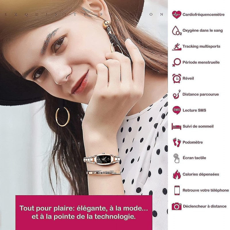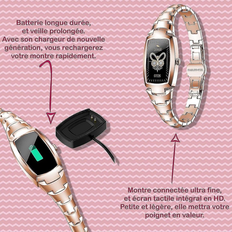 Ceas inteligent și monitor de sănătate: Acest ceas inteligent vă permite să înregistrați cu precizie activitățile de pe parcursul zilei, cum ar fi pașii, distanța parcursă, caloriile arse, ritmul cardiac, starea somnului și multe altele. Acest ceas inteligent acceptă mai multe moduri sportive. Ceva care să vă mențină motivați pe tot parcursul zilei. Acest ceas inteligent este o alegere excelentă de cadou. Notificări de apeluri și mesaje: Acest ceas inteligent (auriu roz sau argintiu) va vibra atunci când primiți apeluri sau mesaje (Facebook, Twitter, WhatsApp, LINE, Skype, Twitter, WeChat etc.). Veți putea vedea conținutul mesajului direct pe ceas. Dacă sunteți ocupat, puteți închide direct. Acest ceas elegant, de înaltă tehnologie, pentru femei, cu rating IP67, se mândrește cu unele dintre cele mai inteligente funcții de pe piață, cum ar fi prognoze meteo sincronizate, mementouri pentru sedentarism, un ceas deșteptător cu vibrații, control complet asupra muzicii și camerei, controlul telefonului prin intermediul ecranului ceasului, un cronometru, reglarea luminozității (ridicați încheietura mâinii pentru a ilumina ecranul), încărcare rapidă magnetică și multe altele. Mai mult decât un simplu ceas de damă! Acest ceas inteligent dispune de un ecran tactil IPS de înaltă definiție de 1,09 inci (2,54 cm) și este fabricat din oțel inoxidabil pentru o experiență de utilizare mai bună, toate acestea cu un aspect elegant. De asemenea, măsoară tensiunea arterială, nivelul de oxigen din sânge și ciclul menstrual, oferind o monitorizare completă. Durată lungă de viață a bateriei și compatibilitate largă. Ceasul Bluetooth pentru femei este compatibil cu Android 4.4 și iOS 8.0 și versiuni ulterioare (necesită Bluetooth 4.0 și versiuni ulterioare). Este potrivit numai pentru conectarea la smartphone-uri, nu la computere, iPad-uri sau tablete. Scanați codul QR sau descărcați/instalați aplicația „F Fit” din magazinul de aplicații al telefonului. Deschideți-o și activați Bluetooth. Faceți clic pe „Adăugați dispozitiv” și selectați ceasul. Bucurați-vă.